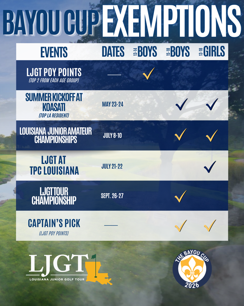 Just like in 2025, Team LJGT will be comprised of 12 total players. Four players from the boys’ 13-14 division, four players from the boys’ 15-18 division, and four players from the girls’ 13-18 division. Please see the graphic below to see how players from each division can earn exemptions onto Team LJGT for the 2026 Bayou Cup.